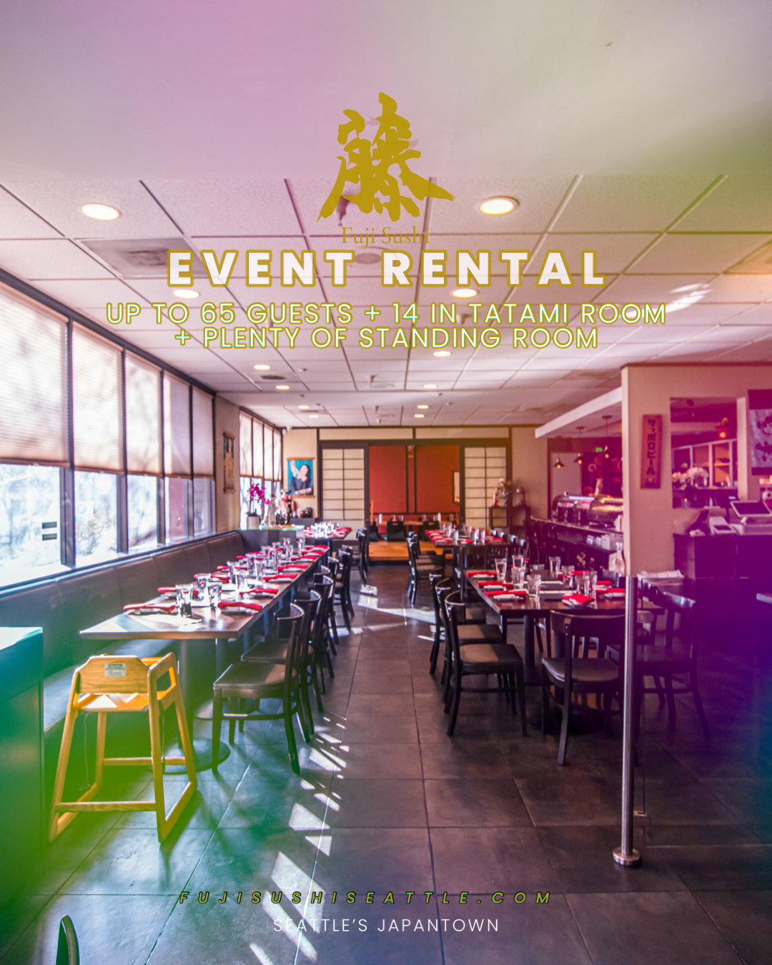 RENT OUR ENTIRE DINING ROOM TO CELEBRATE ANY EVENT OR FESTIVITIES. FOR LARGE PARTIES THAT WANT AN EXCLUSIVE FUJI EXPERIENCE. HOST IT FOR UP TO 65 SEATS + 14 IN OUR TATAMI ROOM WITH PLENTY OF STANDING ROOM.